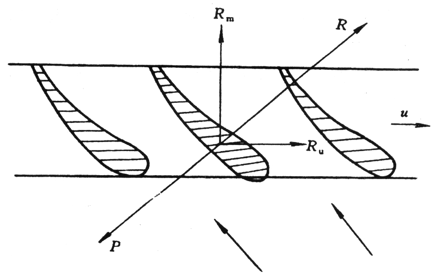 軸流草莓视频成人APP的葉輪是由數個相同的機翼形成一個環型葉柵,若在草莓视频成人APP的葉輪上以同一半徑展開,如圖7-22示。當葉輪旋轉時,葉柵以速度u向前運動,氣流相對於葉柵產生沿著機翼表麵的流動,所以氣體對機翼產生升力P,而機翼對流體產生一反作用RR力分解可得RmRuRm使氣體獲得沿軸向流動的能量,力Ru使氣體產生繞軸的旋轉運動,所以氣流經過葉輪做功後,作繞軸的沿軸向運動。